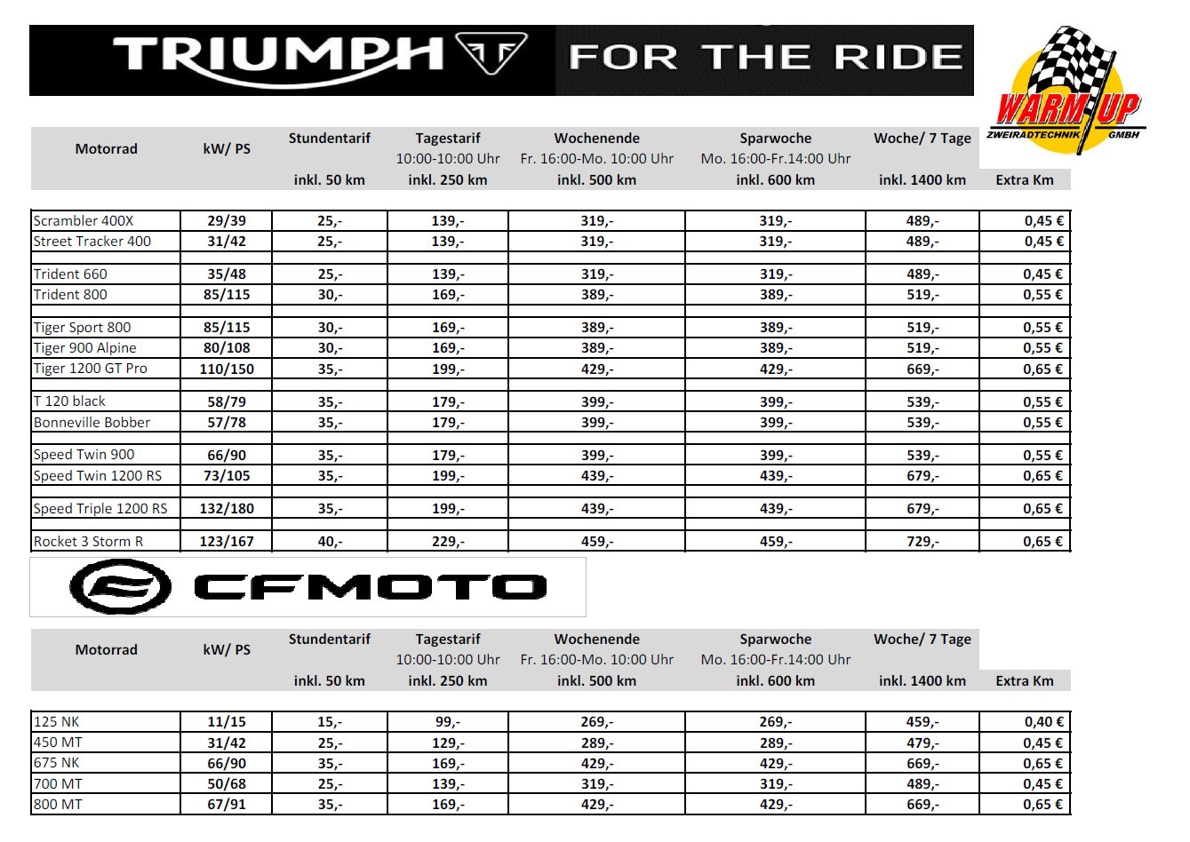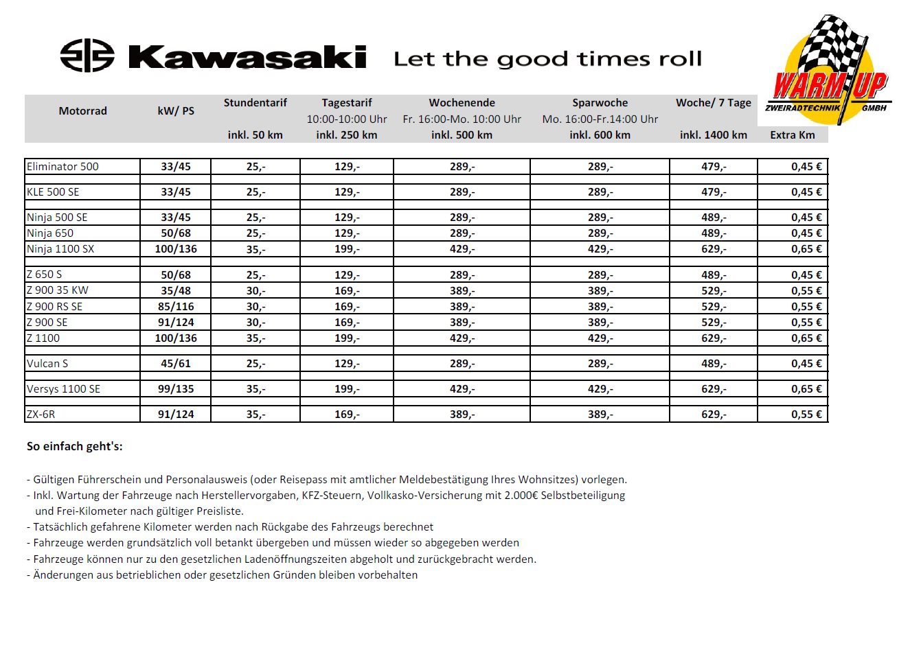 Vor Antritt einer jeder Fahrt sollte der Mieter den technischen Zustand von Reifen, Kette, Öl usw. kontrollieren.